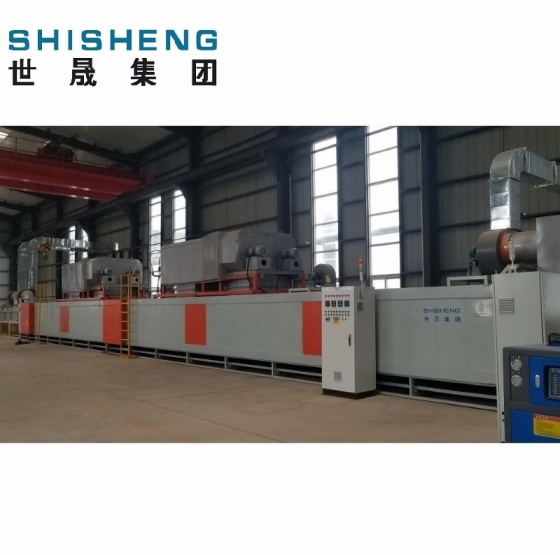 燃?xì)饩W(wǎng)帶固化爐主要由進(jìn)料段、燒結(jié)爐(預(yù)烘區(qū)、燒結(jié)區(qū))、出料段、強(qiáng)冷系統(tǒng)、熱風(fēng)發(fā)生爐、網(wǎng)帶傳動機(jī)構(gòu)、電氣控制系統(tǒng)組成。